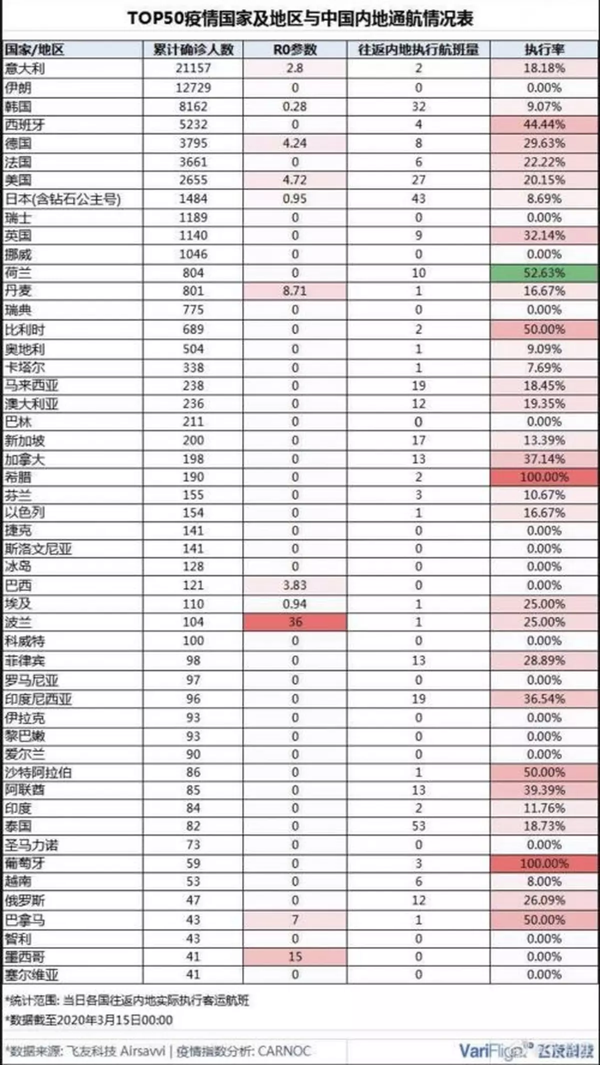 此外,飛友科技最新數據顯示,截至3月15日零點,美國累計確診人數為2655人,往返中國內地執行航班量為27班,執行率為20.15%;英國累計確診1140人,往返內地執行航班量為9班,執行率為32.14%;法國累計確診3661人,往返內地執行航班量為6班,執行率為22.22%;義大利累計確診21157人,往返內地執行航班量為2班,執行率為18.18%。