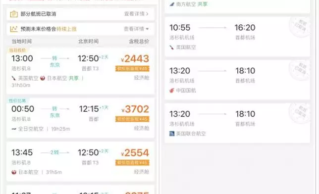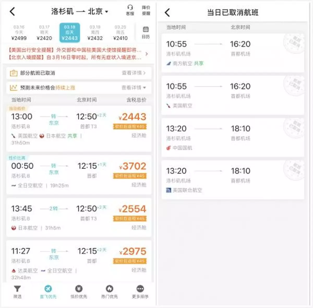 新京報記者在某在線旅遊平台發現,3月18日,有24趟從美國洛杉磯飛北京的航班機票在售,其中除一趟中國國航執飛的航班為直飛以外,其餘全部為中轉,經濟艙票價從2443元至41667元不等。另有4趟航班已取消行程。
