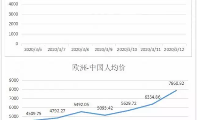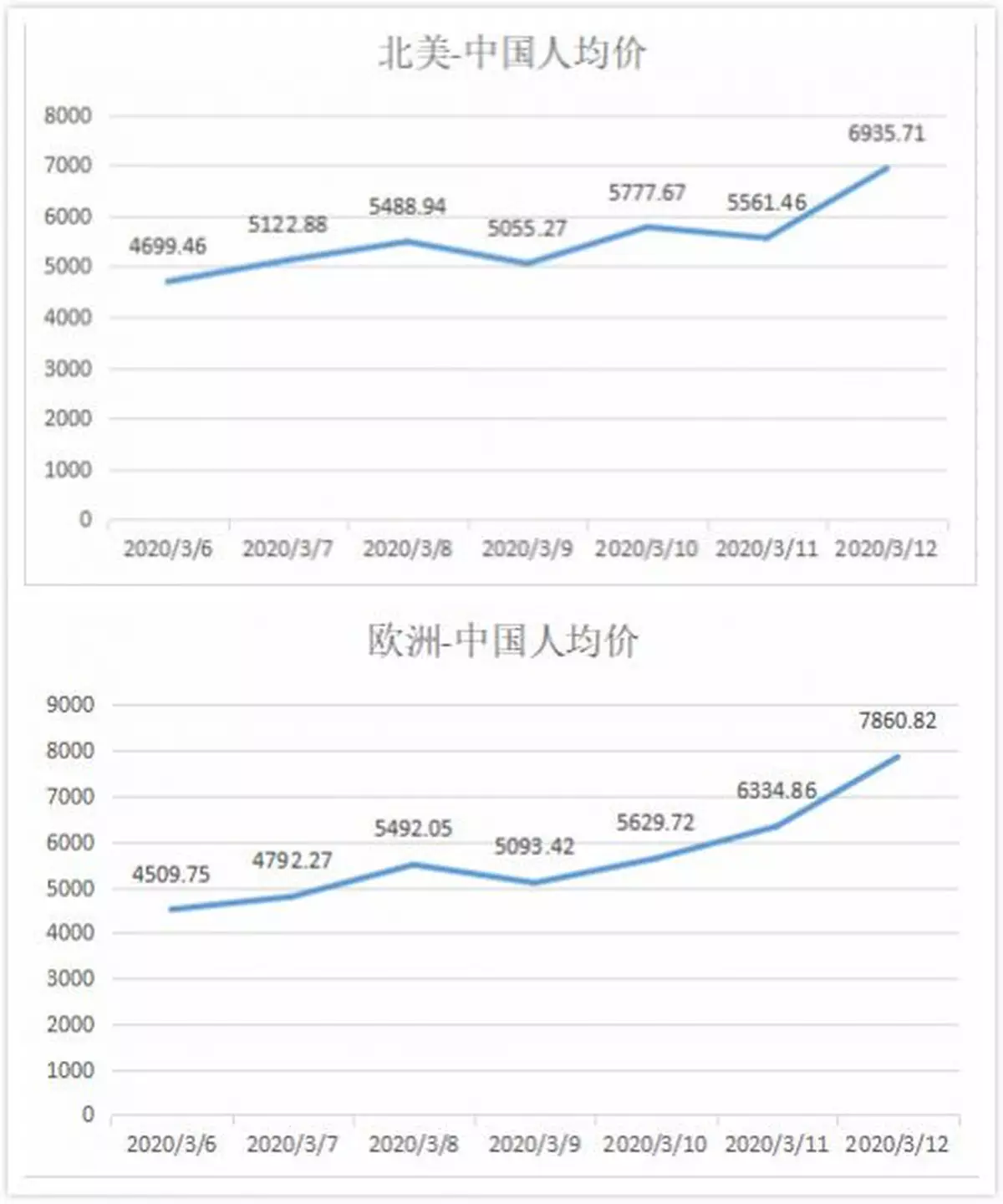 另據去哪兒網數據,3月6日至3月12日期間,北美航線飛中國及歐洲航線飛中國的人均票價一路走高,在將近一周的時間裡,歐洲飛北京航線的人均票價已從4509.75元升至7860.82元。