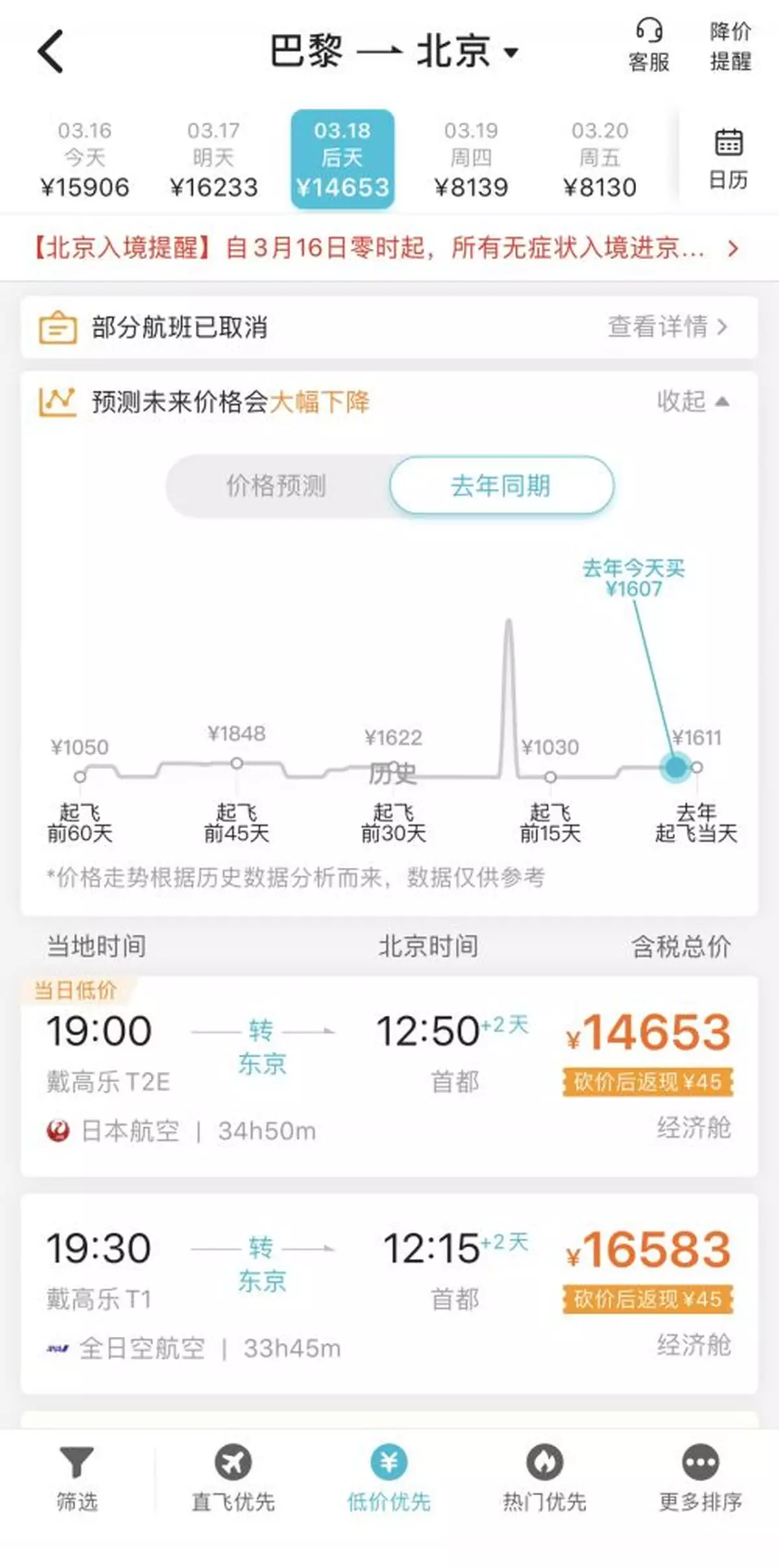 3月18日從法國巴黎飛北京的航班共有5趟在售,另有3趟被取消,票價最低為14653元,最高為32607元,而去年同期購買該航線機票的最低價格僅有1607元。