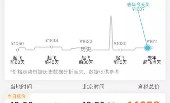 中國國航執飛的從洛杉磯直飛北京的航班原計劃共有2趟,其中3月18日13:20起飛的航班已被取消,只剩一趟當天1:40起飛的航班,該航班3月16日10點預訂經濟艙的票價已經漲至41667元,且顯示票少。新京報記者在某在線旅遊平台展示的該航班歷史價格數據發現,從2月16日至今,該趟航班的機票預訂價格就從6096元一路飆升至目前的4萬多元,而3天前的3月13日,這趟航班的票價也只不過13041元。
