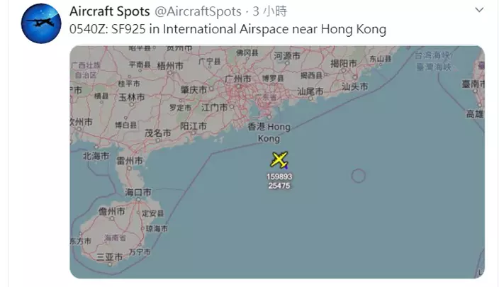 追蹤飛機動向的社交網站「飛機守望」,發布美軍軍機飛行路線圖,顯示美軍一架EP3E偵察機上午從沖繩嘉手納基地出發後,途中經過台灣南方的巴士海峽,進入南海空域,在超過兩萬呎高空執行任務,一度飛近香港。