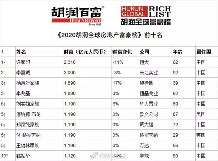 胡潤研究院公布《2020全球房地產富豪榜》,恒大集團主席許家印以2,310億元人民幣(約2,530億元)的身家蟬聯全球房地產首富。長和系創辦人李嘉誠以2000億元(約2,190億港元)位列第二。同樣是房地產大亨的美國總統特朗普,則以約為210億元人民幣(約230億港元)位列第86位,比去年下降4位。