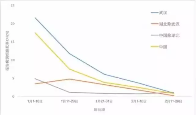中國新冠肺炎病死率(總病例中報告的死亡人數)不同地點隨時間的變化圖,截至 2020 年 2 月 20 日。