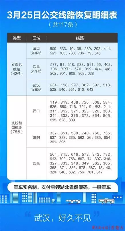 3月25日恢復的公交線路共計117條,包括漢口、武昌、武漢等三大火車站始發的42條公交線路;中心城區(含武漢東湖新技術開發區、武漢經濟技術開發區)75條區域公交線路(含微循環公交線路)。投放的公交運力為全網運力的30%,後期還會根據客流情況,對運力進行動態調整。