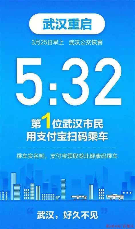自3月25日起,武漢恢復部分公交線路運營。3月28日起,恢復軌道交通1號線、2號線、3號線、4號線、6號線、7號線運行。恢復運行的公交、地鐵線路的開收班及運營時間,仍按車站公示時間實施。今天最早恢復運行的首發車時間是5:30,僅僅用了兩分鐘,第一位武漢乘客就通過支付寶掃碼完成實名登記,乘坐上了518路公交車。