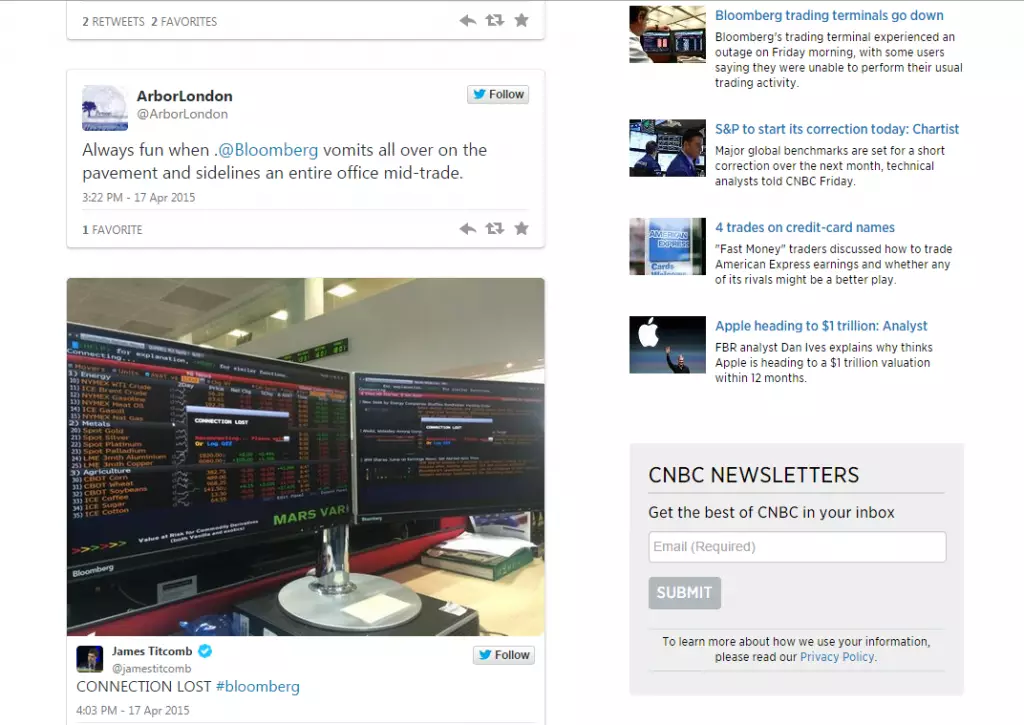 CNBC亦引述歐資交易員表示,歐洲股市早段受彭博死機影響,交易量顯著減少,有交易員更於Twitter鬧爆,指彭博死機對環球金融市場穩定構成嚴重風險。