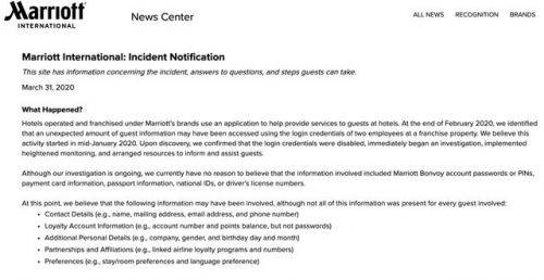 據官網介紹,這次被入侵可以追溯到1月中旬,最終在2月底發現特許經營店中兩名僱員的登錄憑證可能已訪問了大量的客戶信息。隨後,萬豪將登錄憑證禁用,立即展開調查。