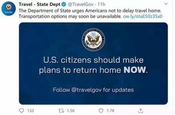 美國國務院領事事務局呼籲,在海外的美國人儘快回國,“美國國務院敦促美國人不要延期回國,可能很快所有交通工具都無法使用。”