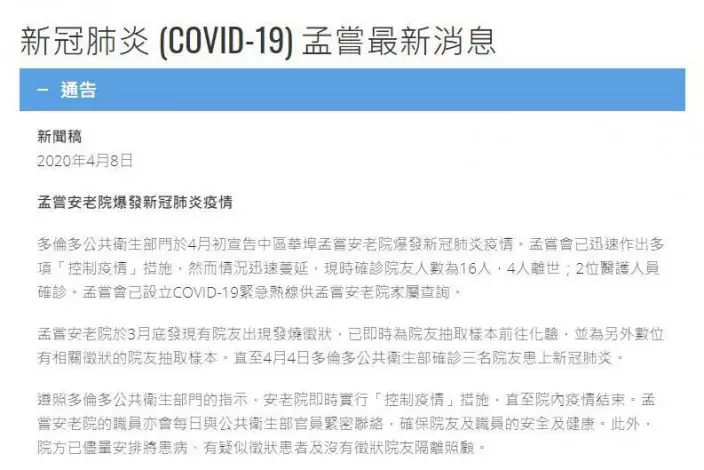 加拿大政府衛生部門無公布,孟嘗安老院在4月8日自行發聲明,指新冠肺炎病毒已在院內蔓延。
