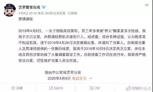 9日夜間,山東省煙台市公安局芝罘分局發佈案情通報,稱鮑某某涉嫌性侵「養女」案偵查工作仍在進行中。