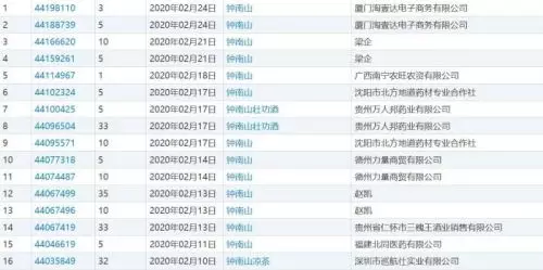 在中國商標網,以「鍾南山」為關鍵詞,進行商標搜索的部分結果顯示。