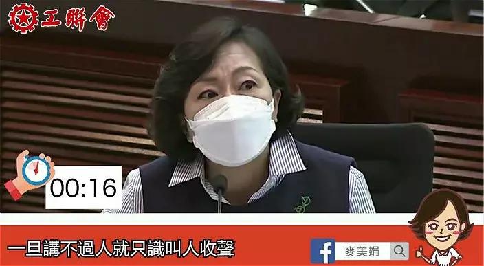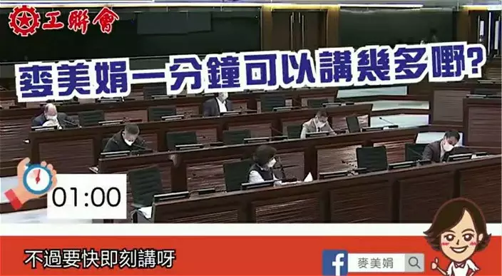 工聯會立法會議員麥美娟(Alice)一向給人硬淨的形象,發言上更是躋身「重炮」行列,但原來她不單止係「重炮」,都係「連珠炮」。話説在立法會會議上,Alice只得一分鐘發言時間,一分鐘只有60秒,時間又短又緊迫,多數人可以完成發言已經好好,更遑論咬字清晰同條理分明!
