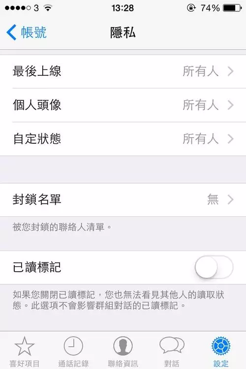 只要進入右下角的設定、帳號、隱私,再關閉「已讀標記」功能便可,不過當選擇後,別人亦同樣會看不到自己的情況。