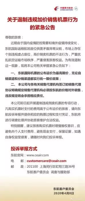 面對諸多爭議,航空公司不得不出面回應。4月8日,東方航空發佈《關於遏制違規加價銷售機票行為的緊急公告》。