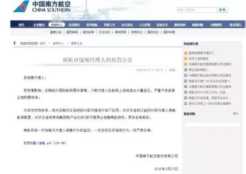 如,南航3月27日發佈《南航對違規代理人的處罰公告》稱,對近期涉及違規的93家代理進行處罰:對涉及違規訂座的90家代理人屏蔽航信配置,對涉及違規使用集團客戶運價的3家代理停止銷售南航授權。同時南航將進一步加強對代理人銷售行為的監控,一旦發現任何違規行為,將嚴肅處理。