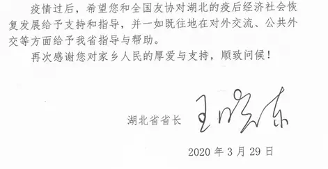 湖北省長致信感謝
