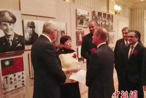 △2015年11月,《為了正義與和平——中美二戰合作圖片展》在內華達州拉斯維加斯舉行。李小林向來賓介紹70多年前被李先念所率新四軍一部救助的美國援華飛行員本尼特的照片