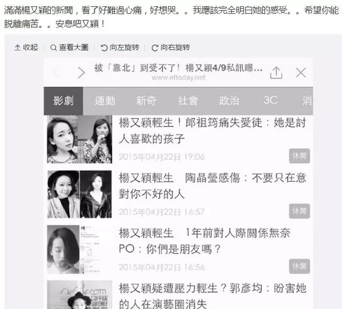 Liddy在微博寫下:「滿滿楊又穎的新聞,看了好難過心痛,好想哭..我應該完全明白她的感受..希望妳能脱離痛苦..安息吧又穎!」