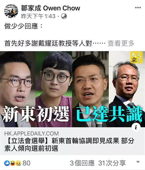 鄒家成在facebook出帖回應。