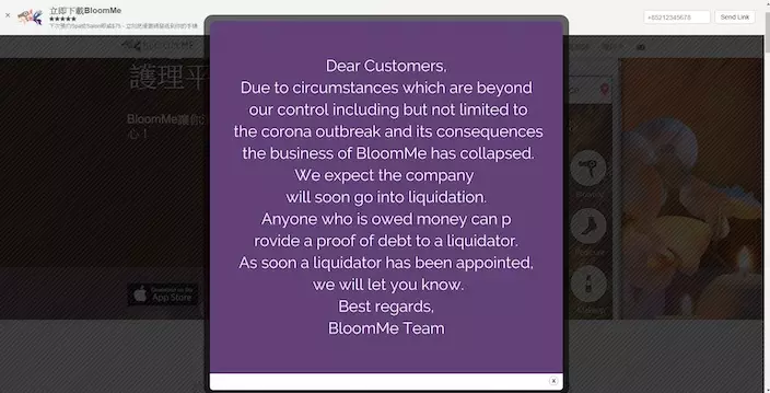 「BloomMe」是美容業內最大型平台之一,於2015年成立,用戶可以預約超過1300 間水療及美容中心,累積超過25萬用戶。合作商戶需要每年繳交年費,平台則收取3成佣金,平台以月結形式轉帳。有商戶於周二突然收到平台電郵通知,指公司會即日終止預約平台服務,指用戶可於下周一前匯出資料,但內容並無提及有關商戶金錢上的善後安排。