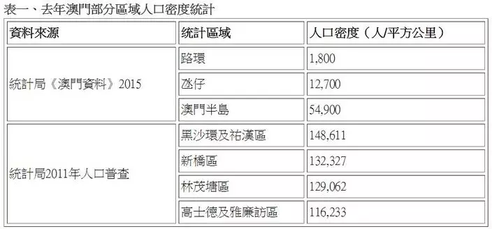 美國中情局(CIA)早前出版調查報告《世界概況》,羅列全球各國家及地區的人口密度排名( 詳見表二),其中,澳門高居榜首,比全球人口密度第二高、面積不足兩平方公里的歐洲小國摩納哥的16,818人還高兩成多,與鄰近的香港相比更是高出三倍多。