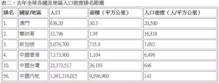 中國內地人口密度僅為每平方公里143人,排全球各國及地區人口密度榜第56位。