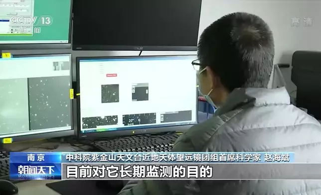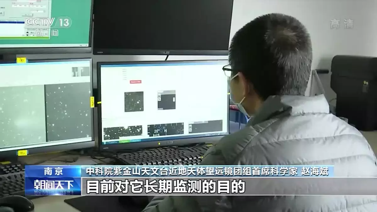 中科院紫金山天文台近地天體望遠鏡團組首席科學家 趙海斌:目前全球一直在監測它,但是由於這個目標慢慢地朝南半球的上空飛去,盱眙(觀測)站在5月最接近地球的時刻,已經無法再觀測到它了,但是南半球的望遠鏡會接力觀測。所以說近地小行星的監測,是一個全球網接力觀測,需要多點布站。