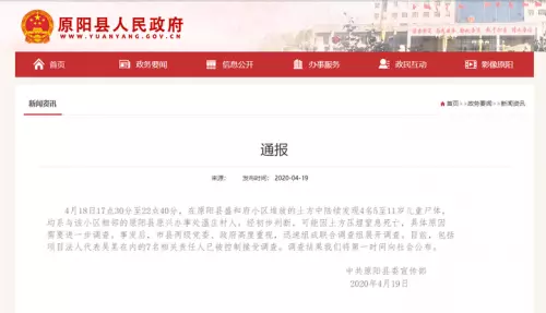 19日凌晨,河南省原陽縣人民政府網站通報,4月18日17點30分至22點40分,原陽縣盛和府小區堆放的土方中陸續發現4名5至11歲兒童屍體,經初步判斷,可能因土方壓埋窒息死亡,具體原因需要進一步調查。
