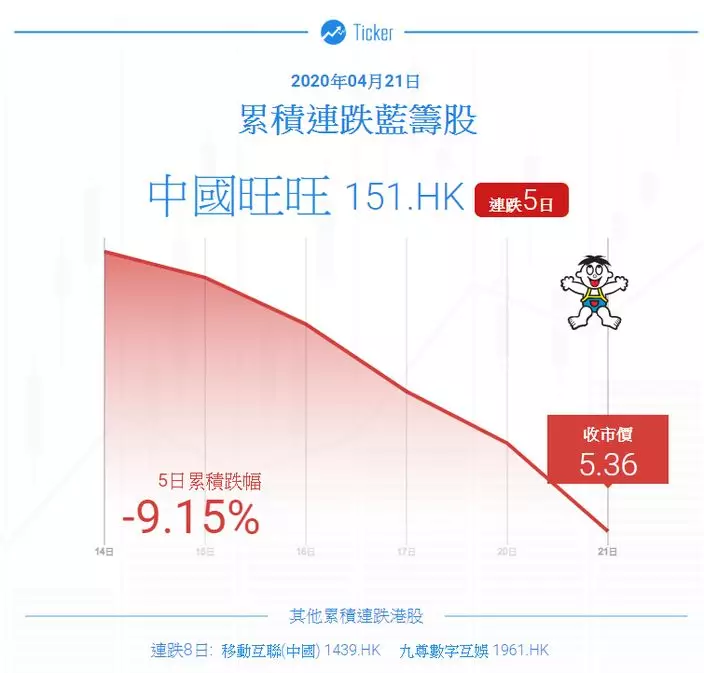 中國旺旺(00151)連跌5天,累跌9.15%,今日跌3.07%,報5.36元,最低見5.323元,成交5590萬元。
