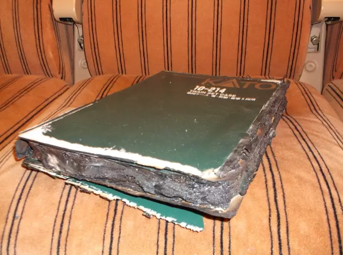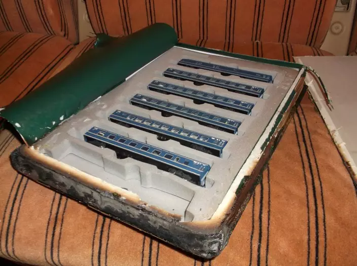 從他展示的照片可以看出,綠色盒子形狀大致完整,仍可看到綠色包裝,只有包邊處被燒至焦黑。打開盒子就可看見幾節幾乎完好無損的火車模型,連防震棉也沒有受到太多損害。他亦上載其他牌子模型盒做對比,損毀的程度相較之下就嚴重許多,裡面的模型也被熏黑。