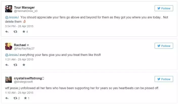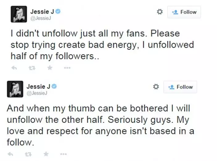 事後Jessie J兩次留言:「我不僅只取消關注我的粉絲,希望大家不要發放負能量,我也取消關注了我一半跟隨者」。