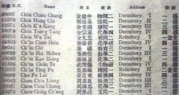 1940年燕京大學的入學登記表:第5行寫明金無怠學號為:40353,考入新聞系,入住「一食堂」