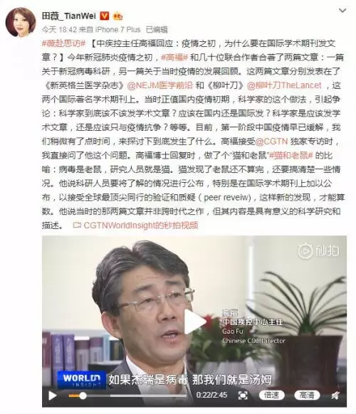視台主持人田薇通過其個人微博賬號@田薇_TianWei發佈了一條採訪中國疾控中心主任高福的視頻。視頻中,高福主任說明了疫情之初在國際醫學期刊發表文章的原因。