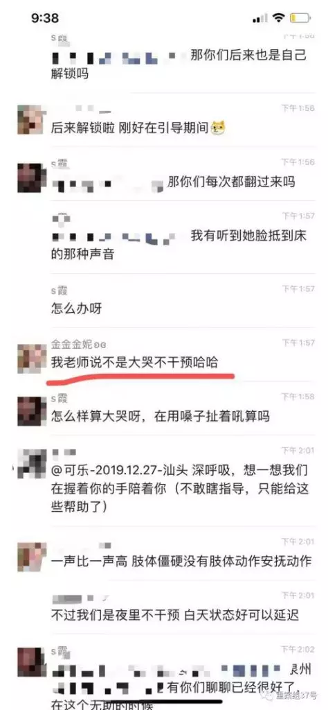 另一名群友建議,「我的老師說,不是大哭並不干預」。“怎麼樣算大哭,扯著嗓子吼算嗎?怕她悶到。”「s霞」問。