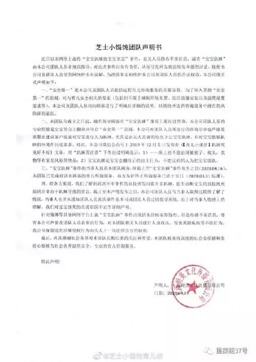 此外,該公司聲明稱,當事人未通知該公司稱前述死亡事件系該公司或涉事團隊人員過錯指導所致。經了解,前述嬰兒死亡的直接原因不是趴睡所致的窒息,該事件的直接誘發因素也不是趴睡,但對寶寶致死的直接原因不作詳細聲明。