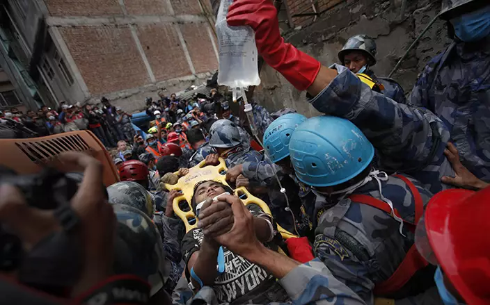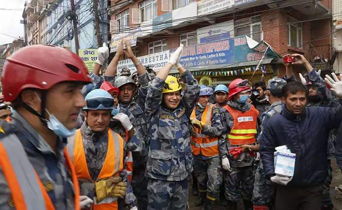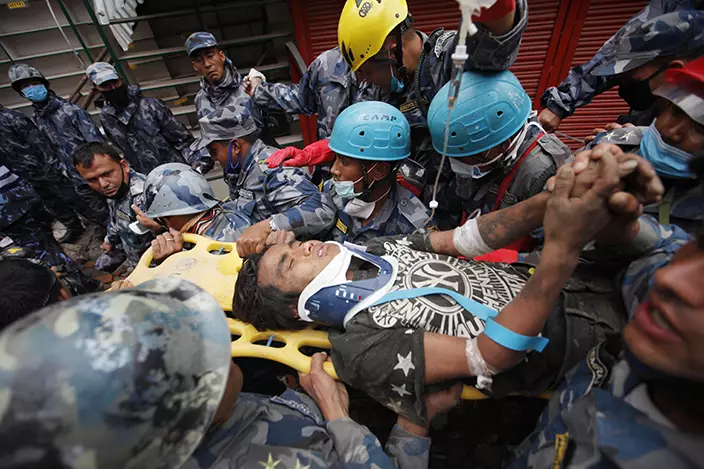 救援隊伍星期四在首都加德滿都貢格布區一間塌下的小旅館瓦礫堆中,發現15歲少年拉馬(Pemba Lama)。當地救援人員和美國支持人員合力花一小時將他救出來。