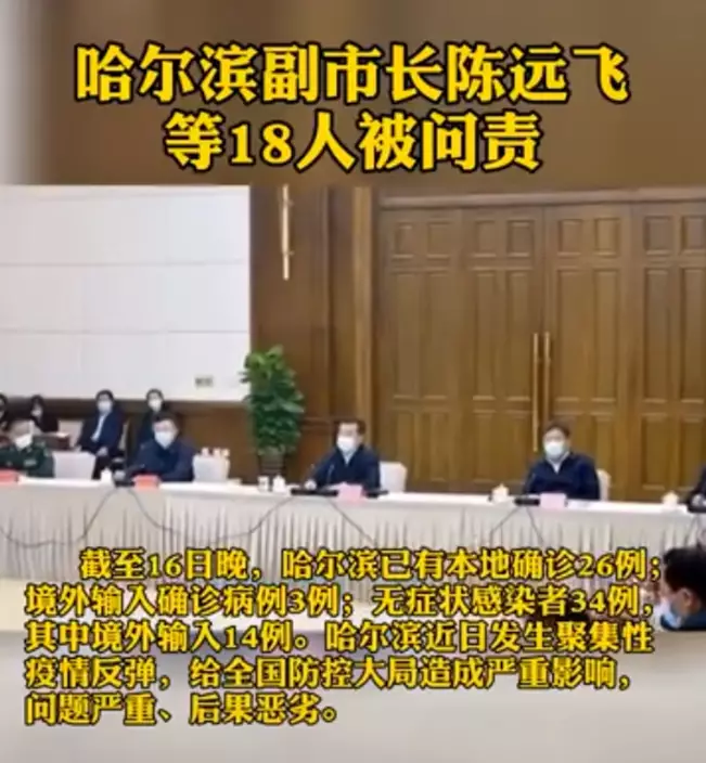 哈爾濱市疫情領導工作小組指揮部副總指揮陳遠飛;哈爾濱醫科大學黨委常委、副校長傅松濱,對疫情防控不力,不盡責不擔當不作為,導致市內疫情出現反彈,造成嚴重後果及不良影響,處以政務記過。另外16人因組織管理不到位,違反疫情防控期間診療規定,受相應黨紀政務處分。