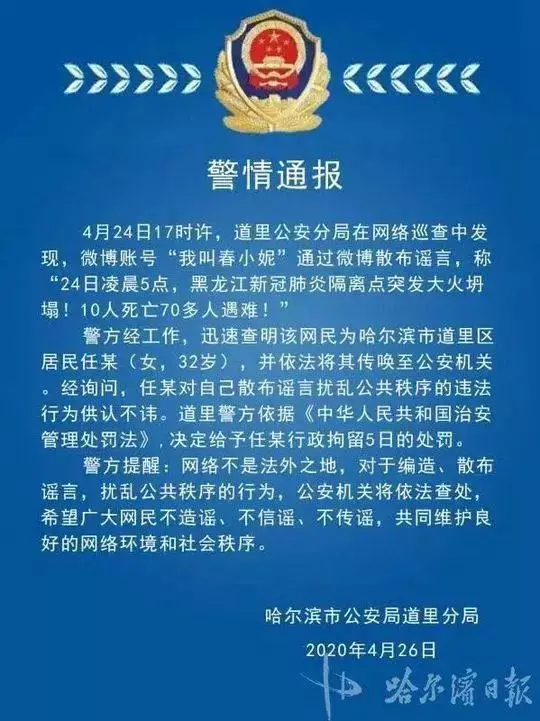 「哈爾濱日報」微信公眾號4月26日消息,4月24日17時許,哈爾濱道里公安分局在網路巡查中發現,微博賬號「我叫春小妮」通過微博散佈謠言,稱「24日凌晨5點,黑龍江新冠肺炎隔離點突發大火坍塌!10人死亡70多人遇難!」