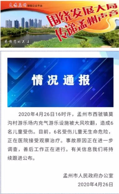 據通報稱,4月26日16時許,孟州市西虢鎮莫溝村遊樂場內充氣遊樂設施被大風吹翻,造成6名兒童受傷。目前,6名受傷兒童無生命危險,正在醫院接受觀察治療。事故原因正在進一步調查,善後工作正在進行,有關信息將持續跟進公佈。