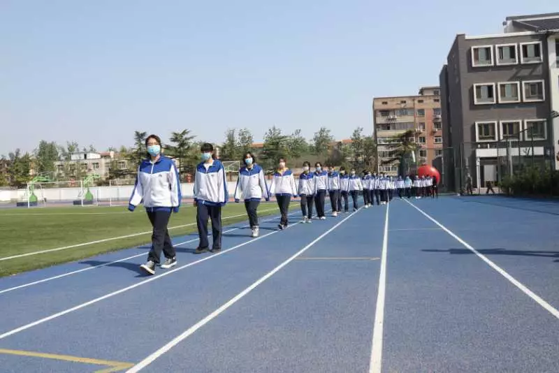 9時許,北京丰台二中,學生保持一米距離走進操場
