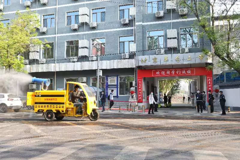 7時許,北京丰台二中,校門外正在進行消殺作業。攝影/新京報記者 王飛