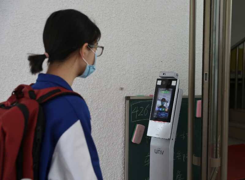 7時許,北京丰台二中,學生測溫後入校。攝影/新京報記者 王飛
