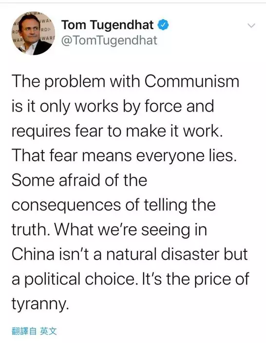 圖根哈特是來自湯布里奇(Tonbridge)和莫靈(Malling)選區的保守黨議員還表示,「冠狀病毒危機突顯出,我們逼切需要更好地了解中國在全球的地位,以及我們與中國的經濟和外交接觸。」
