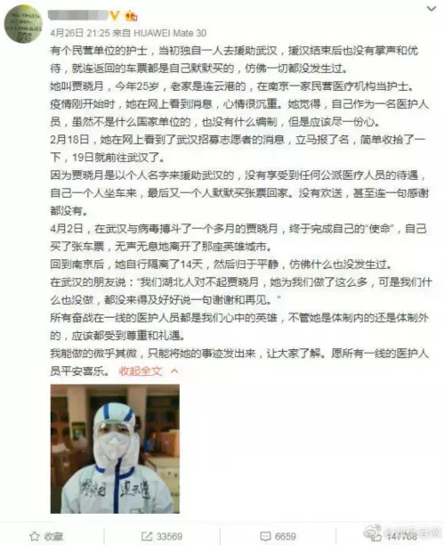 近日,一篇「民營單位護士援助武漢後無掌聲和優待」的網文熱傳,文章稱「連雲港護士賈曉月獨自馳援武漢40餘天,但未獲得任何掌聲與優待,連返程車票都是自己買的」,迅速引發熱議。