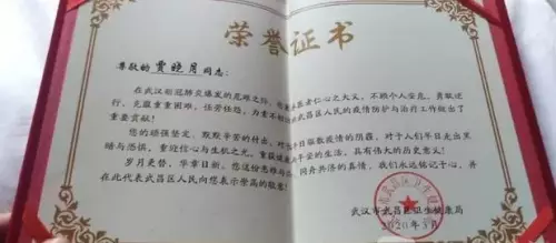 賈曉月表示,自己作為志願者參與抗疫,獲得了政府給予的補助,武昌區衛生健康局也為她頒發了「榮譽證書」。另據其隊友、一名李姓護士透露,她們得到了榮譽證書,在漢工作期間有400元/人/天的補助。