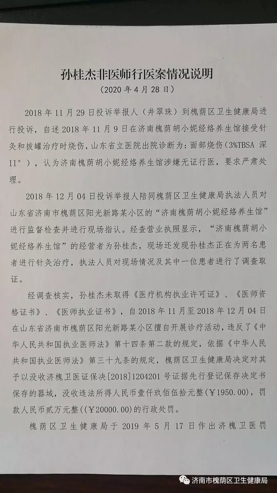 4月28日上午,針對媒體曝出「援鄂中醫返魯後被罰」一事,濟南槐蔭區衛生健康局回應稱,早在2018年便有群眾舉報,在孫桂傑(女)經營的「養生館」接受針灸拔罐時被燒傷,山東省立醫院出院診斷為:面部燒傷(3%TBSA 深II°)。後經查實,孫桂傑未取得相關證書擅自開展診療活動,於2019年5月22日被行政處罰。因其拒不履行,槐蔭區衛健局於今年1月2日向法院申請強制執行。3月23日,槐蔭區法院對「孫桂傑非醫師行醫案」准予強制執行。