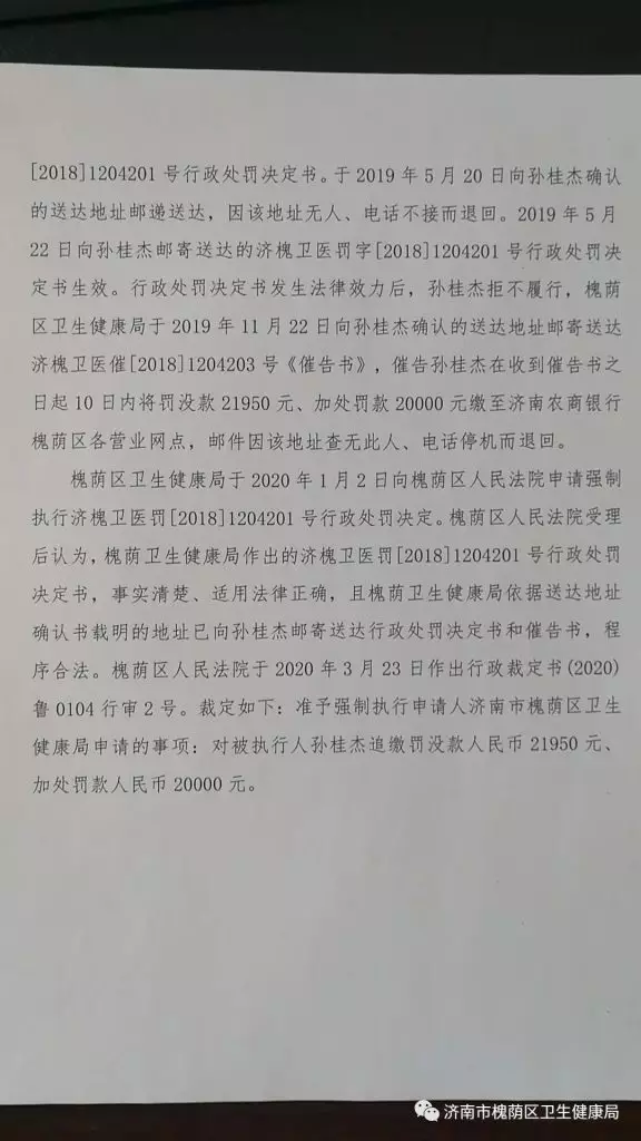 槐蔭區衛生健康局於2020年1月2日向槐蔭區人民法院申請強制執行濟槐衛醫罰[2018]1204201號行政處罰決定。槐蔭區人民法院受理後認為,槐蔭衛生健康局作出的濟槐衛醫罰[2018]1204201號行政處罰決定書,事實清楚、適用法律正確,且槐蔭衛生健康局依據送達地址確認書載明的地址已向孫桂傑郵寄送達行政處罰決定書和催告書,程序合法。槐蔭區人民法院於2020年3月23日作出行政裁定書(2020)魯0104行審2號。裁定如下:准予強制執行申請人濟南市槐蔭區衛生健康局申請的事項:對被執行人孫桂傑追繳罰沒款人民幣21950元、加處罰款人民幣20000元。