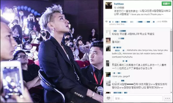 昨晚TAO更新Instagram上載生日會觀賞粉絲製作的短片,並以中文、韓語及英文向外國粉絲表達謝意。