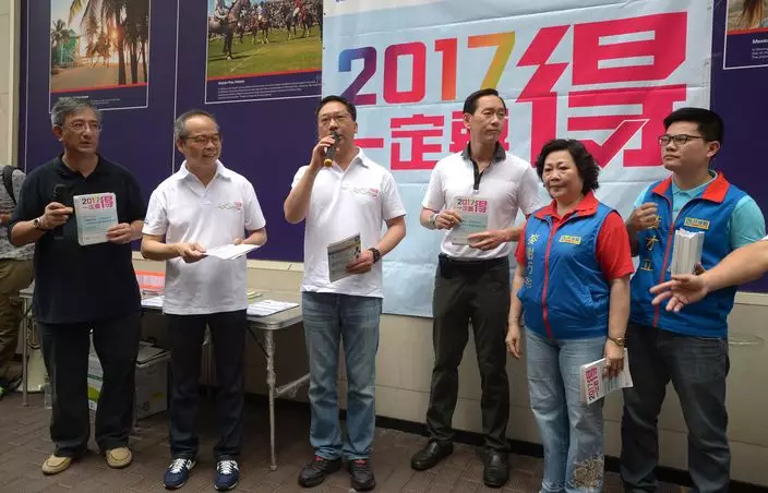 袁國強(左三)、劉江華(左二)、陳智思(右三)落區宣傳政改。
